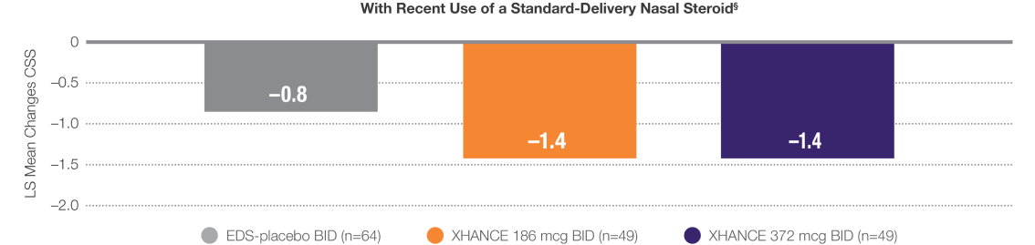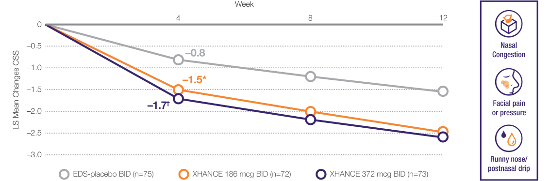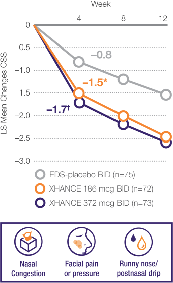 Mean baseline CSS was 6.2, 5.9, and 6.0, respectively, for EDS-placebo, XHANCE 186 mcg, and XHANCE 372 mcg. At Week 4, CSS was –0.8, –1.5, and –1.7, respectively, for EDS-placebo, XHANCE 186 mcg, and XHANCE 372 mcg. The least squares (LS) mean difference in CSS at Week 4 was –0.7 (95% confidence interval [CI]: –1.3, –0.2) in the